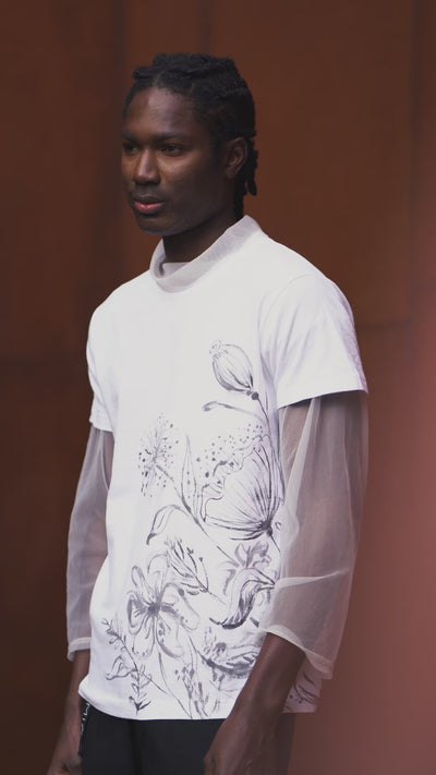 Un capo che unisce artigianalità e stile contemporaneo: questa T-shirt bianca è impreziosita da una delicata illustrazione floreale realizzata a mano, che la rende un pezzo unico e irripetibile. La semplicità della base minimal incontra la raffinatezza del tratto artistico, dando vita a una maglia che celebra la creatività e la cura del dettaglio.